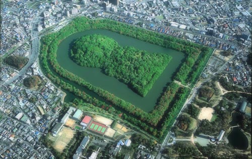 仁徳陵古墳は、日本最大の前方後円墳で全長(墳丘)486メートル、面積約46万平方メートル。三重の濠に囲まれており、エジプトのクフ王のピラミッド、中国の秦の始皇帝陵と並ぶ世界3大墳墓の一つといわれています。上から見ると、円と四角を合体させた前方後円墳という日本独自の形で、5世紀中ごろに約20年をかけて築造されたと推定されています。