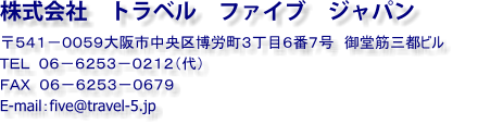 株式会社トラベル ファイブ ジャパン 株式会社トラベル ファイブ ジャパン ■ お問合せ メールでの問い合わせはの方はボタンをクリックしてください。 観光庁長官登録旅行業第823号     日本旅行業協会正会員  支援システム会員